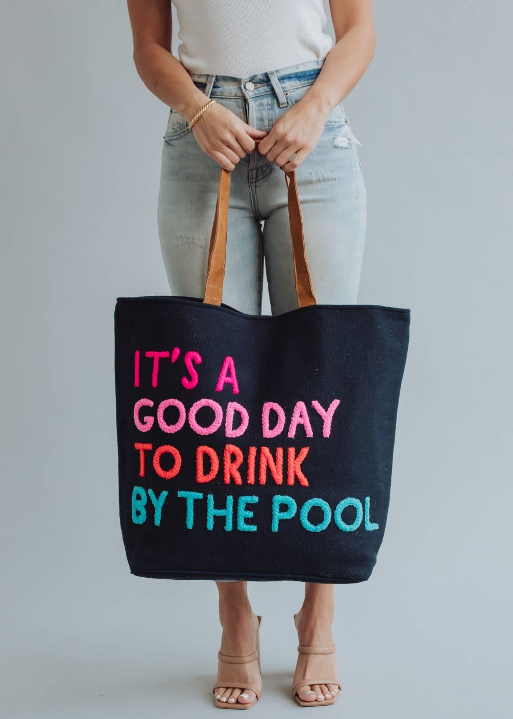 Navy tote Multicolored "It's a good day to drink by the pool" Pink pom tassel 17" x 6.5" x 14.5" 100% Cotton Min. Qty. 2