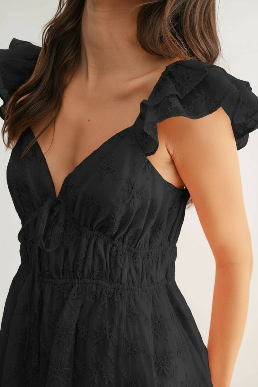 Our Georgia  mini dress is designed with a soft peach color and  floral embroidery throughout the fabric.  Featuring a V-neckline and finished with ruffled sleeves and a tiered skirt for added structure. The waist includes an adjustable drawstring for a secure fit.