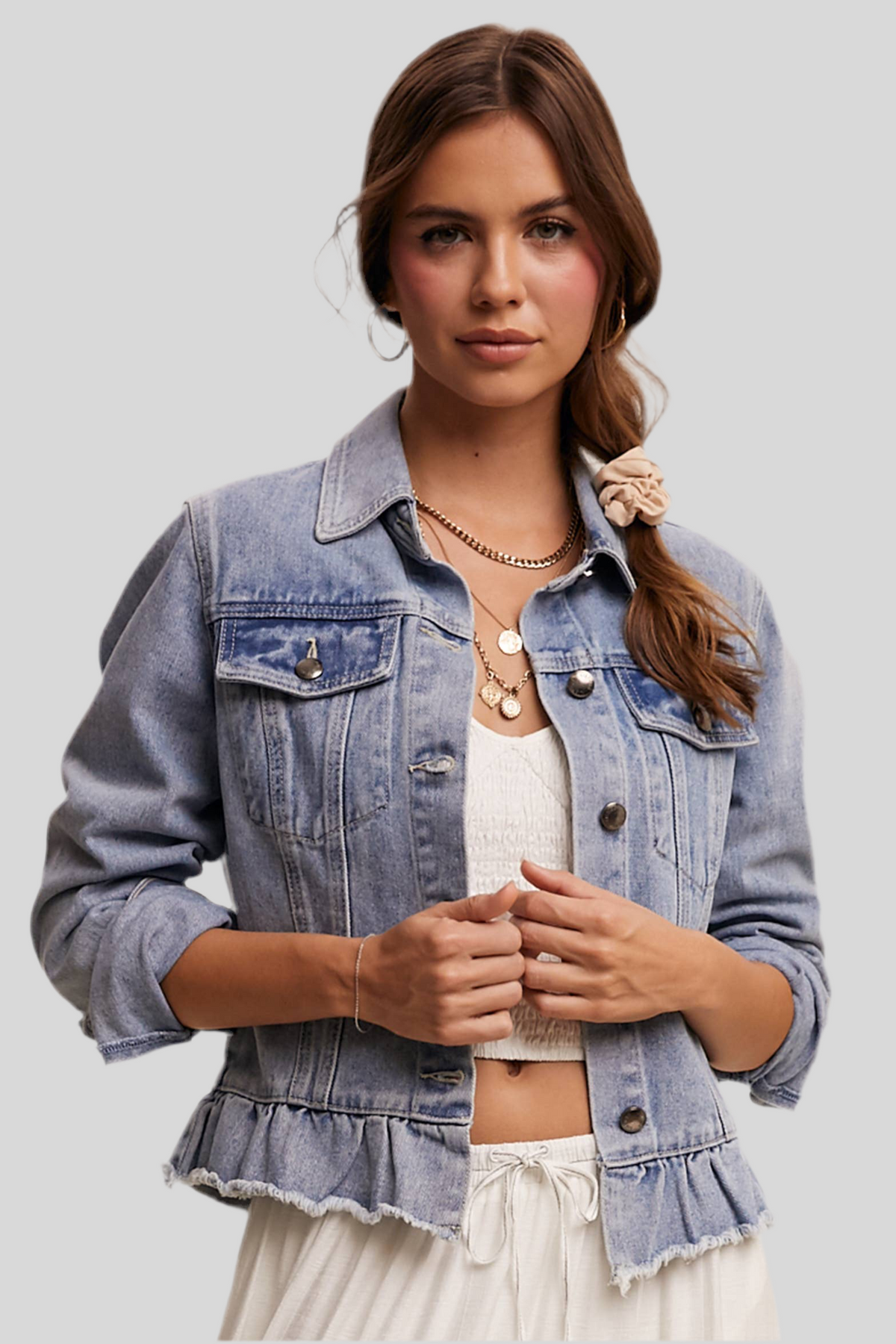 - Model is 5' 7.5" 33-24-34 and wearing a size Small A chic take on a wardrobe staple, this denim jacket blends classic structure with playful ruffle details, making it a stylish layering piece for any casual or dressy look.