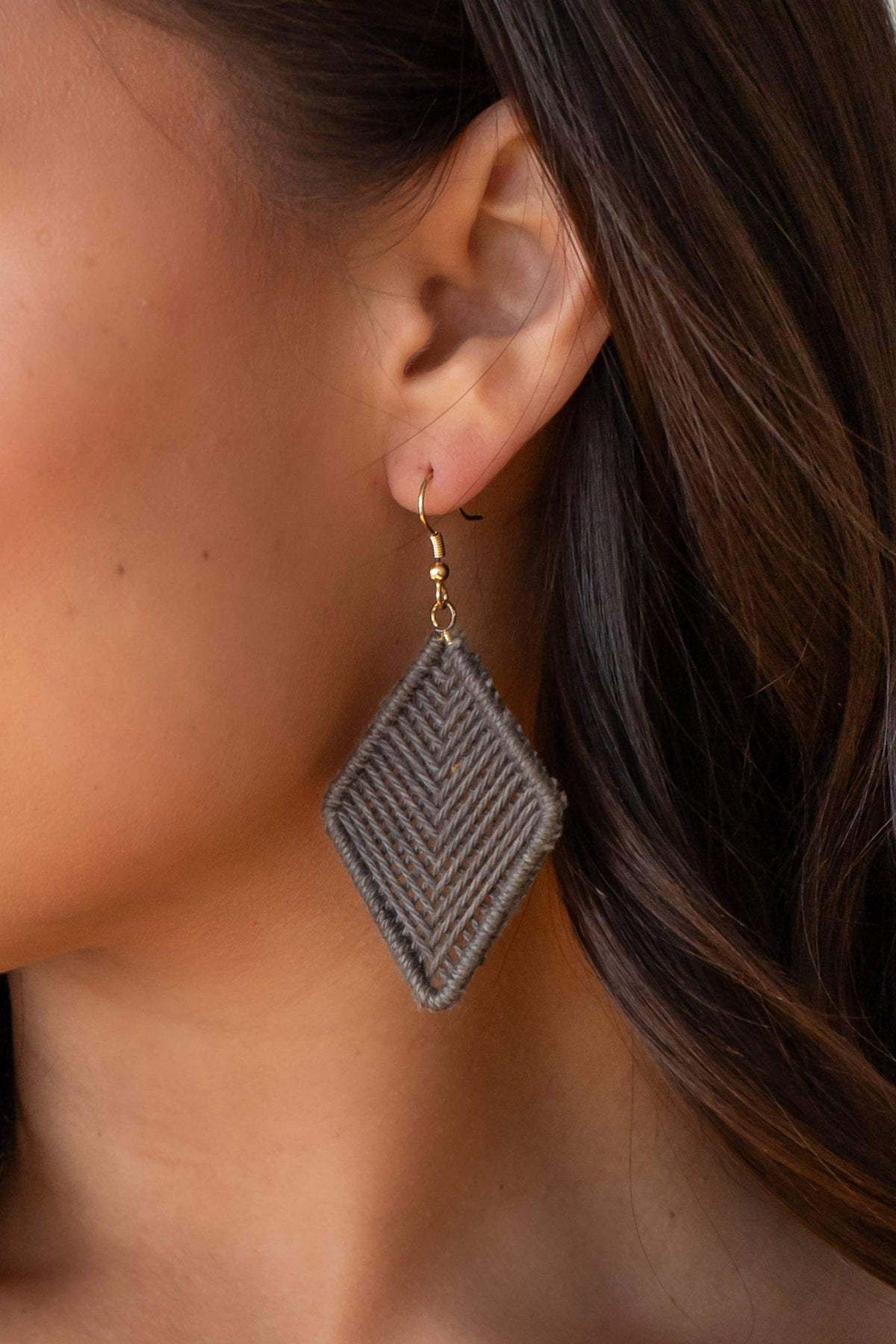 Gray diamond crochet earrings Gold detail 2" length Lead and nickel free  Light weight