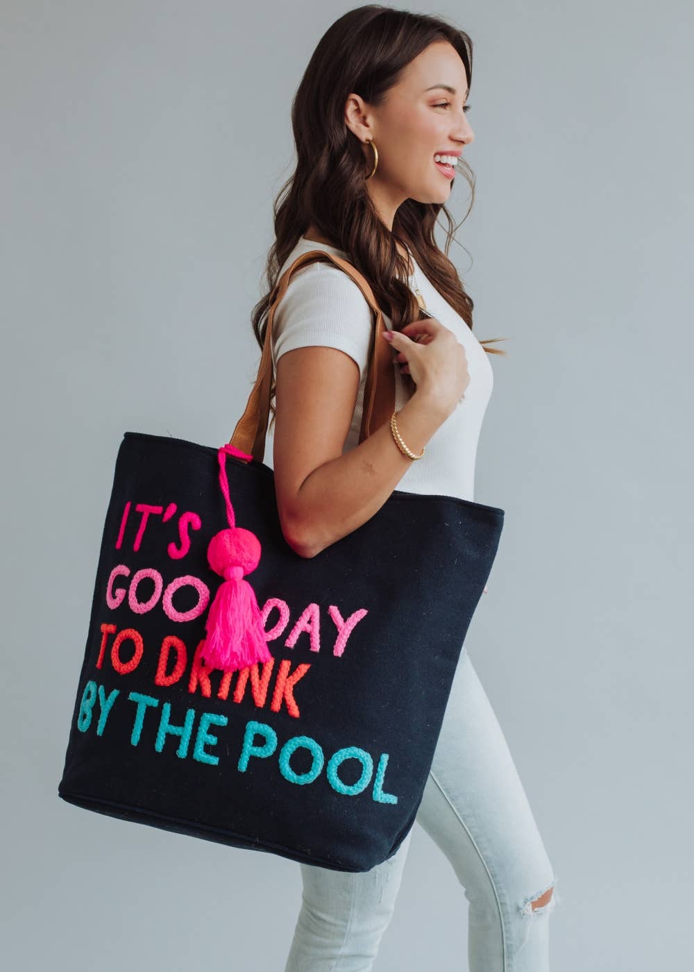 Navy tote Multicolored "It's a good day to drink by the pool" Pink pom tassel 17" x 6.5" x 14.5" 100% Cotton Min. Qty. 2
