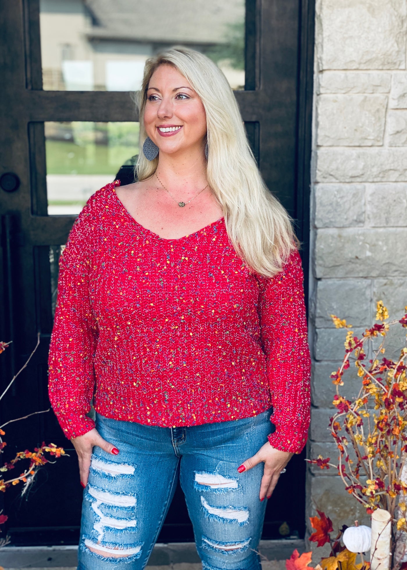 Did someone say sweaters?! -- Ladies we seriously are bringing this sweater into our closet with our arms open. Super comfortable material with detail that you will not be able to resist. Features a knot back and raised multi-color dots. Love it in red? Make sure to check it out in Black and Purple Ash too!